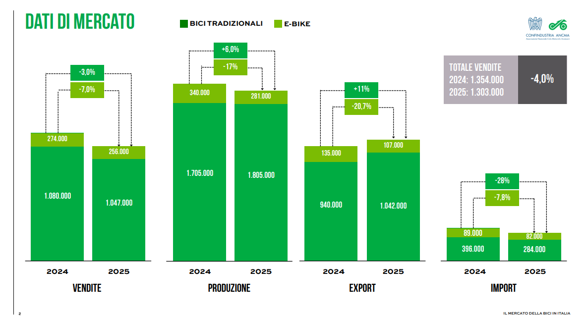 Sul fronte industriale emergono segnali più incoraggianti, almeno per il comparto delle biciclette tradizionali. La produzione raggiunge 1.805.000 unità, in aumento del 6%, mentre l’export sale a 1.042.000 pezzi (+11%). In calo invece le importazioni, ferme a 284.000 unità (-28%).