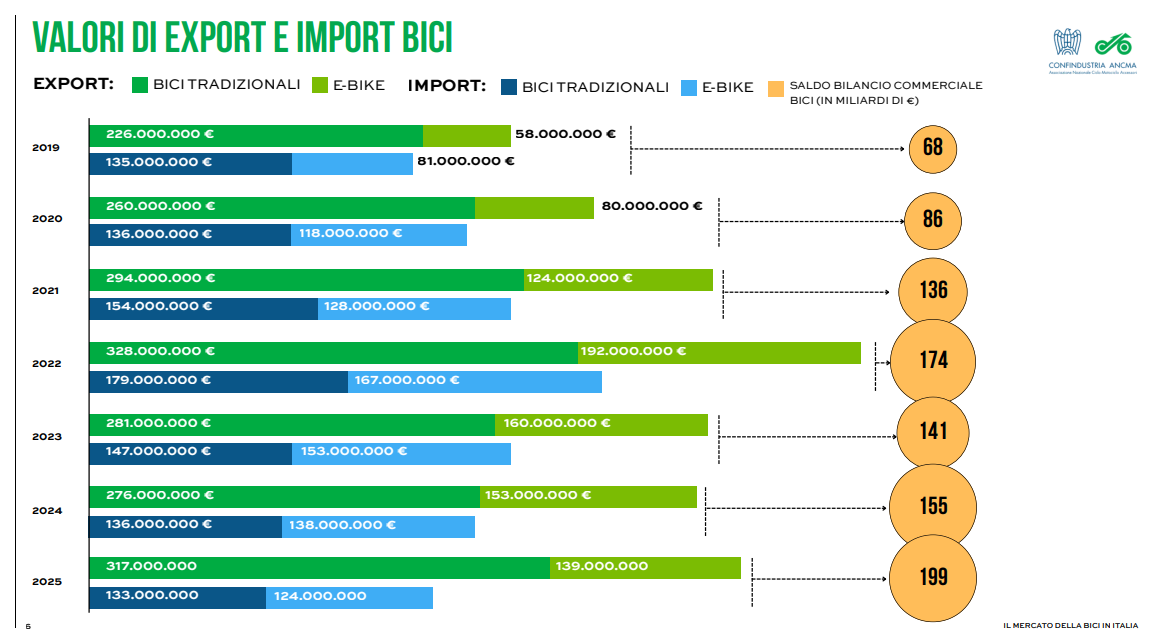 Nonostante il contesto, la bilancia commerciale del settore ciclo resta positiva e sostanzialmente stabile, con un saldo di +172 milioni di euro, leggermente inferiore ai +175 milioni del 2024.